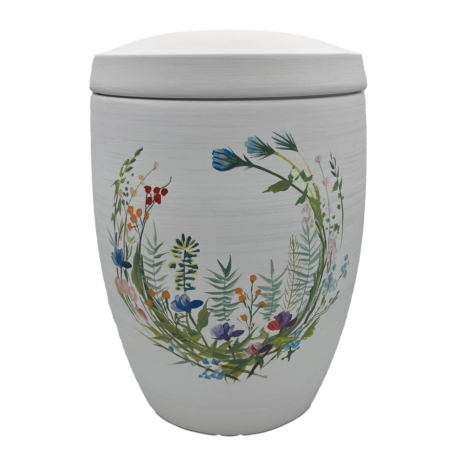 Liebevoll gestaltete Keramikurne mit handgemaltem Blumenkranz aus Wildblumen. Ein wunderschönes und naturnahes Erinnerungsstück für geliebte Menschen.