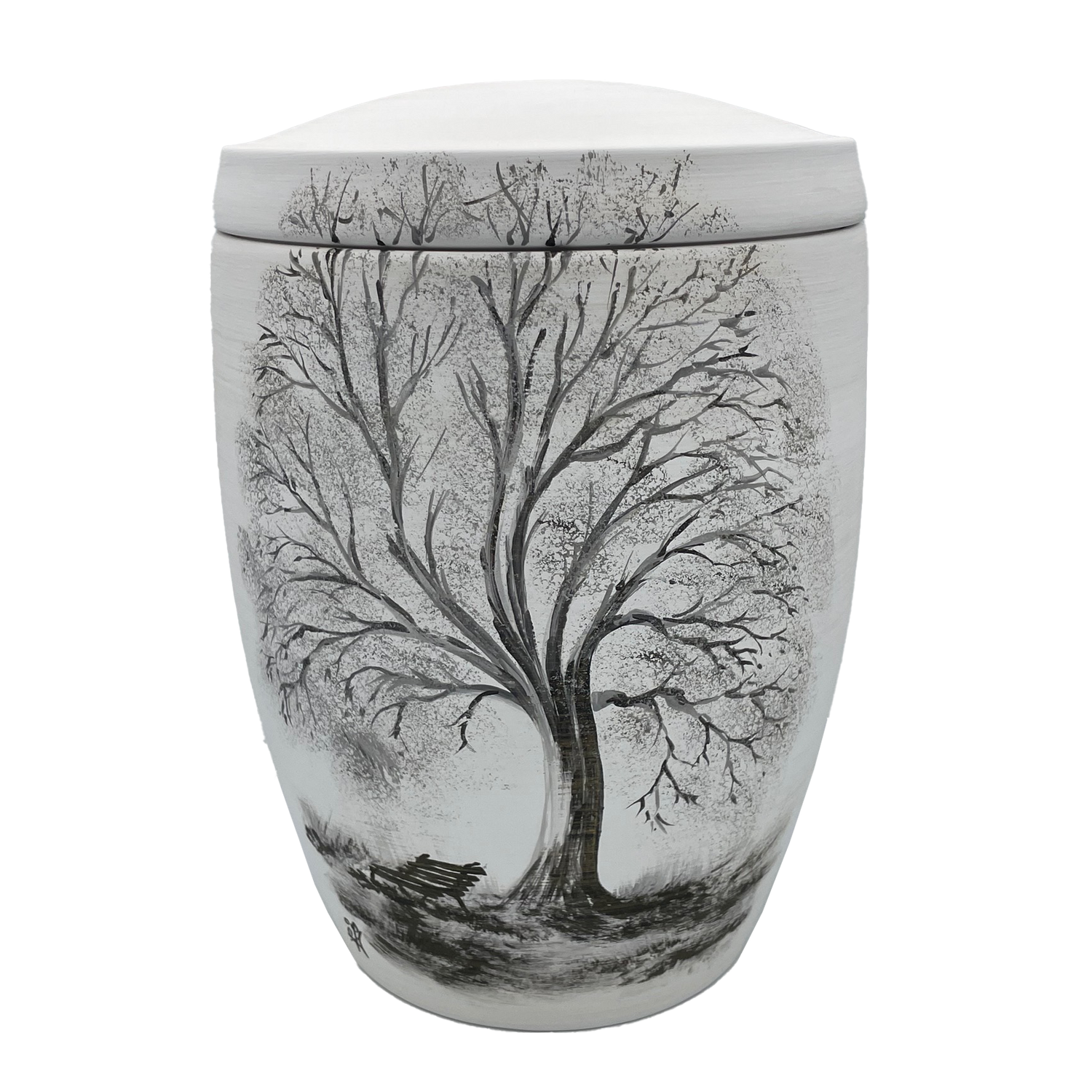 Die handbemalte Keramikurne, ein anmutiger Baum mit Bank, fängt die Essenz von Erinnerungen ein. Künstlerisch gestaltet, symbolisiert sie Trost und Schönheit. Beliebt für ihre emotionale Tiefe und Einzigartigkeit, ehrt sie das Leben auf kunstvolle Weise.